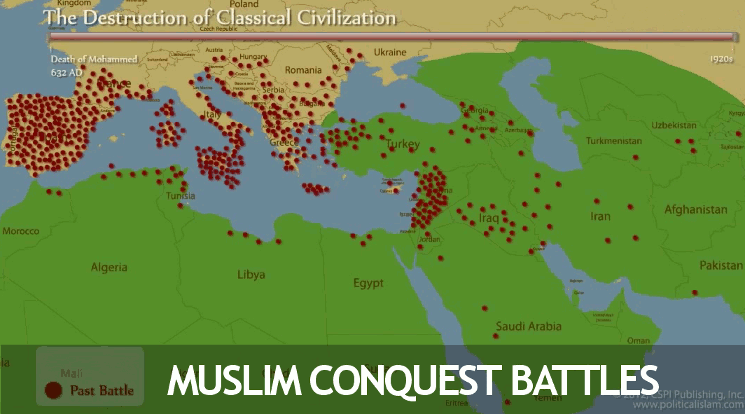 Do Irã à Bósnia e Herzegovina, de Omã à Chechênia, dos Emirados Árabes Unidos à Ucrânia, da Turquia ao Afeganistão, o islamismo se espalhou por tal meio. Não por jesuítas e filosofia patrística e escolástica com universalização de ensino teológico como o cristianismo, mas pela submissão, o próprio significado da palavra islam.